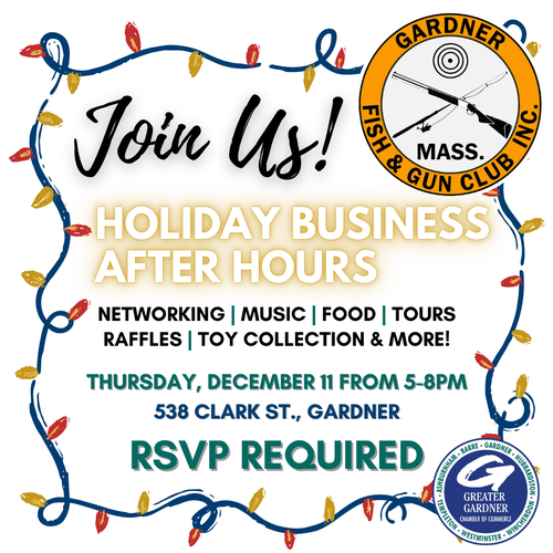 Join us for a Holiday Business After Hours at the Gardner Fish & Gun Club on December 11 from 5–8 PM!